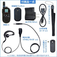 ■耳かけ型イヤホンマイク、ネックストラップ、ベルトクリップ、充電用のアダプタとケーブルが1つずつ付属。