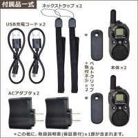 ■ すぐに使える2台組。ネックストラップ、ベルトクリップ、充電用のアダプタとケーブルが2つずつ付属。