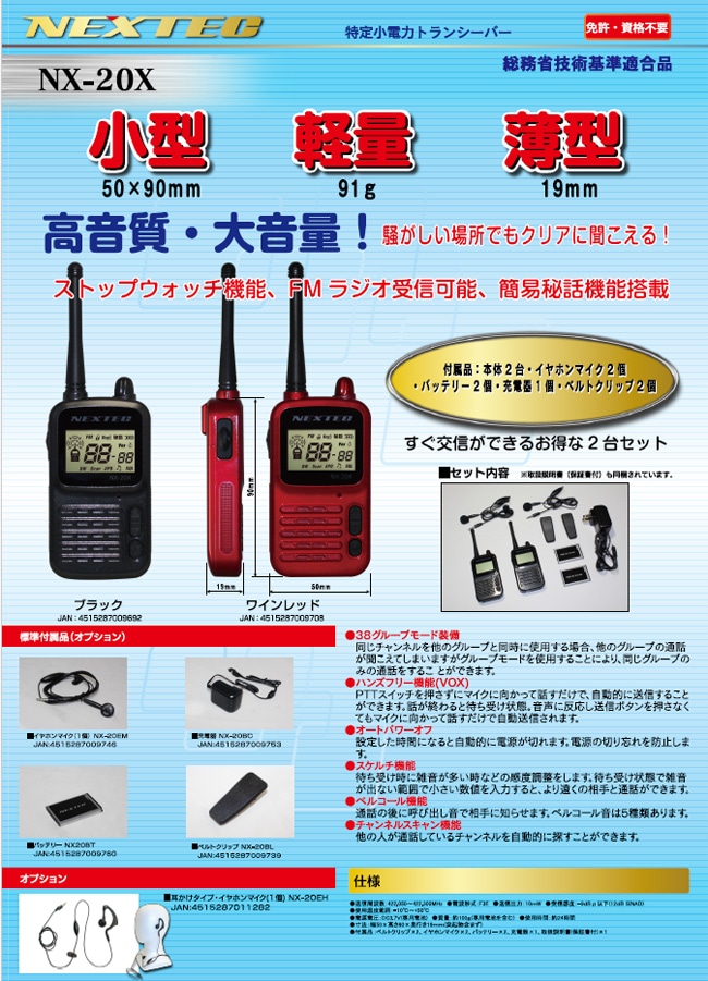 NX-20Xは、9ch機・11ch機・20ch機のトランシーバーと通話することが可能な、2台セットの特定小電力トランシーバーです。
